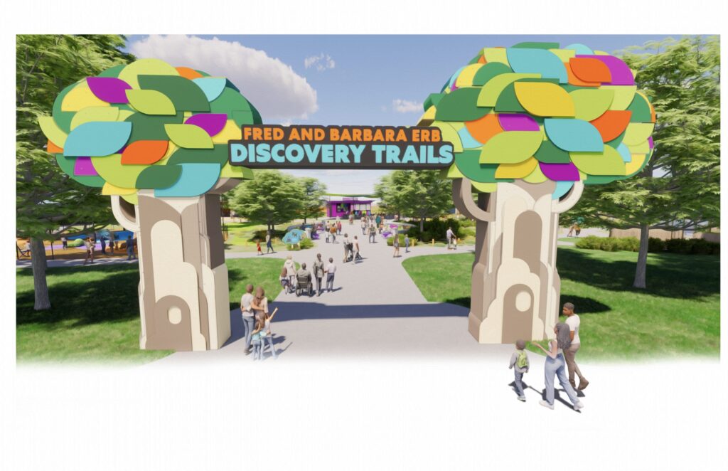 The seven-acre interactive experience will invite children and families into gardens, treehouses, and animal encounters that spark curiosity and wonder. From a flourishing farmer’s market that connects play to sustainability, to an accessible aerial adventure that elevates guests above the ground, the Fred and Barbara Erb Discovery Trails will create spaces where learning and imagination meet. Children will also engage directly with animals, from feeding chickens to carefully interacting with stingrays and bamboo sharks, allowing them to deepen their awareness of and relationship with nature.